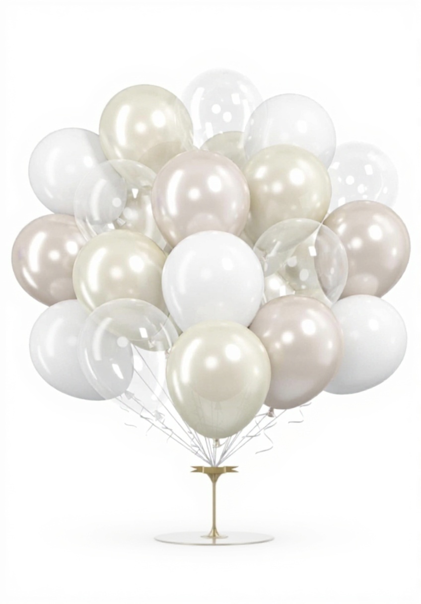Le lot comprend 15 ballons blancs nacrés, 8 blancs vintage, 15 blancs standard et 12 transparents mats, pour une variété décorative complète.