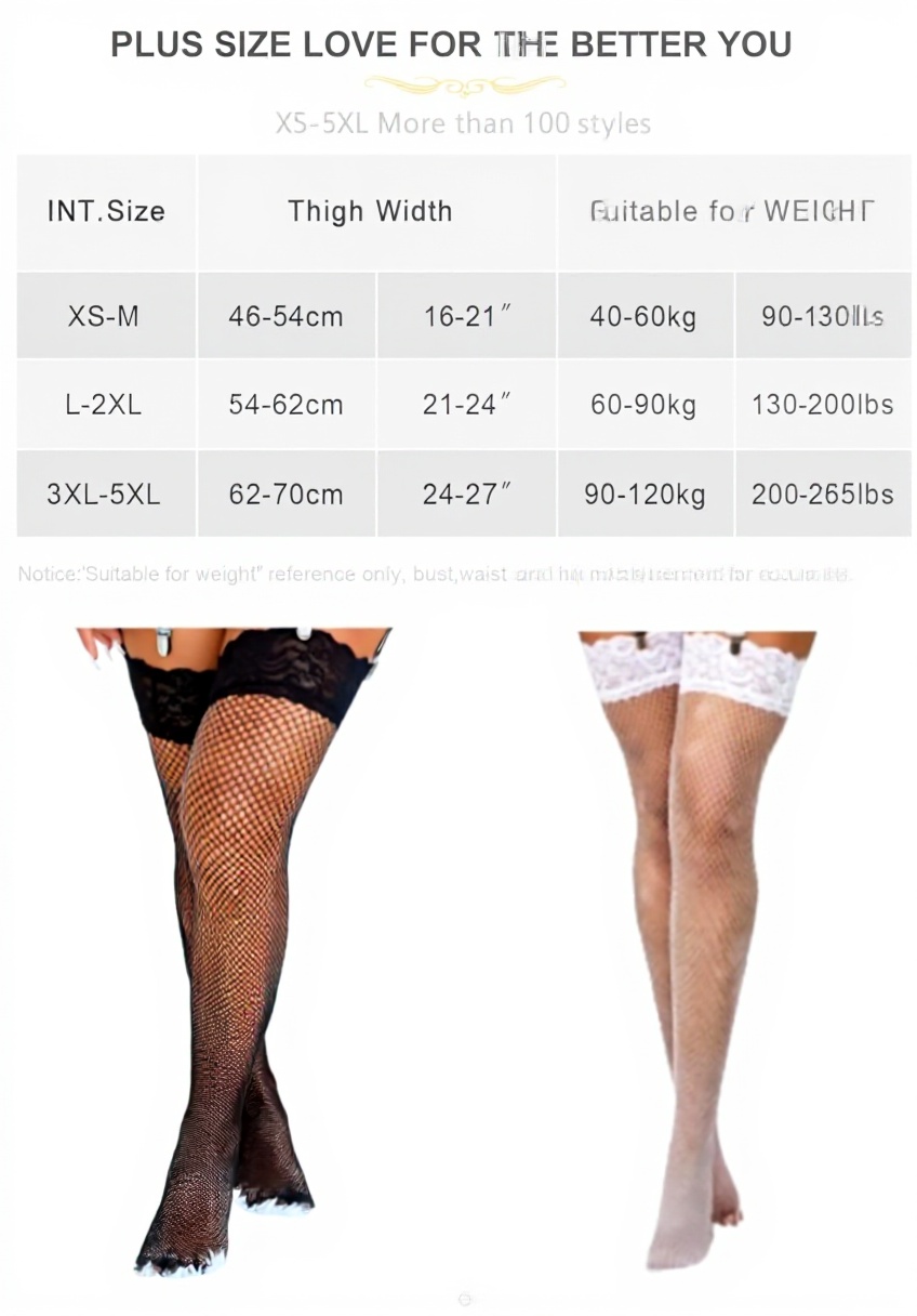 Disponible en tailles XS à 5XL et coloris chair, noir, rouge, blanc et multicolore. Matière élastique légère, bordure en dentelle, conception autofixante sans besoin de jarretelles supplémentaires.