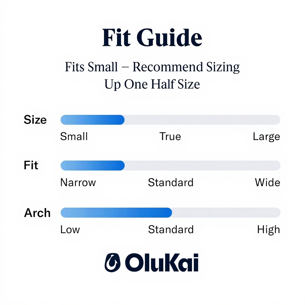 Les baskets Pehuea Li ‘Ili ont une coupe étroite et taillent petit. Il est conseillé de commander une demi-taille au-dessus de votre pointure habituelle pour assurer un ajustement confortable et éviter les serrements.