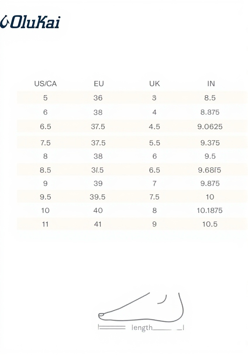 Les pointures suivent les normes standard, mais consultez le guide des tailles OLUKAI pour un ajustement parfait, car le design inclut des panneaux élastiques personnalisables.