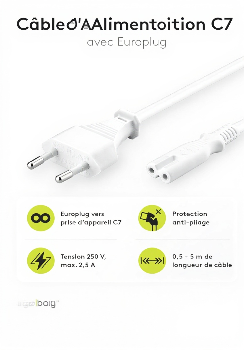 Ce câble d’alimentation Goobay 96035 est conçu avec des matériaux durables pour assurer une transmission électrique stable et sécurisée. Il dispose d’une fiche Euro type C (CEE 7/16) et d’une prise double femelle type C7, adaptée à une large gamme d’appareils électroniques. Sa construction robuste garantit une longue durée de vie et une résistance aux interférences.
