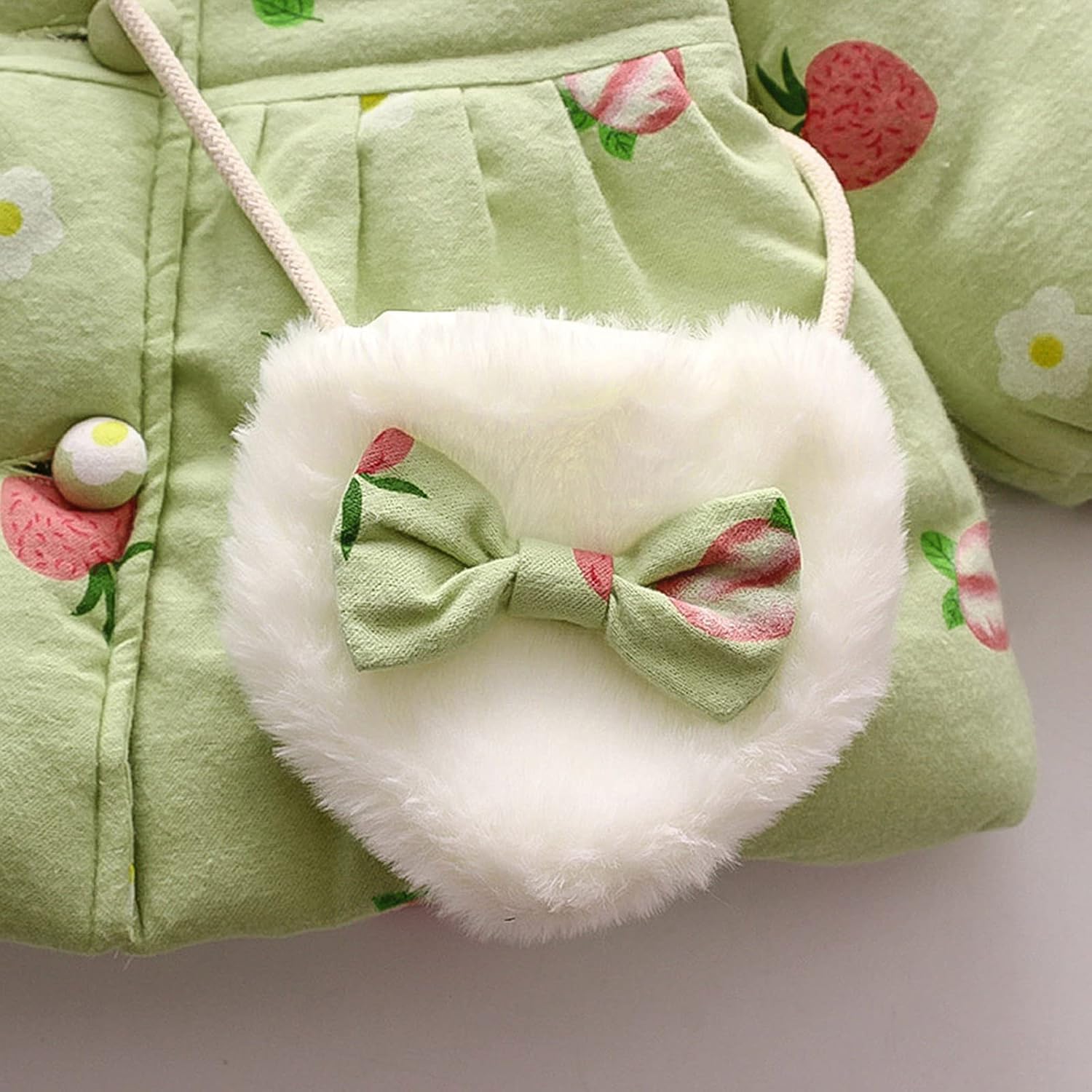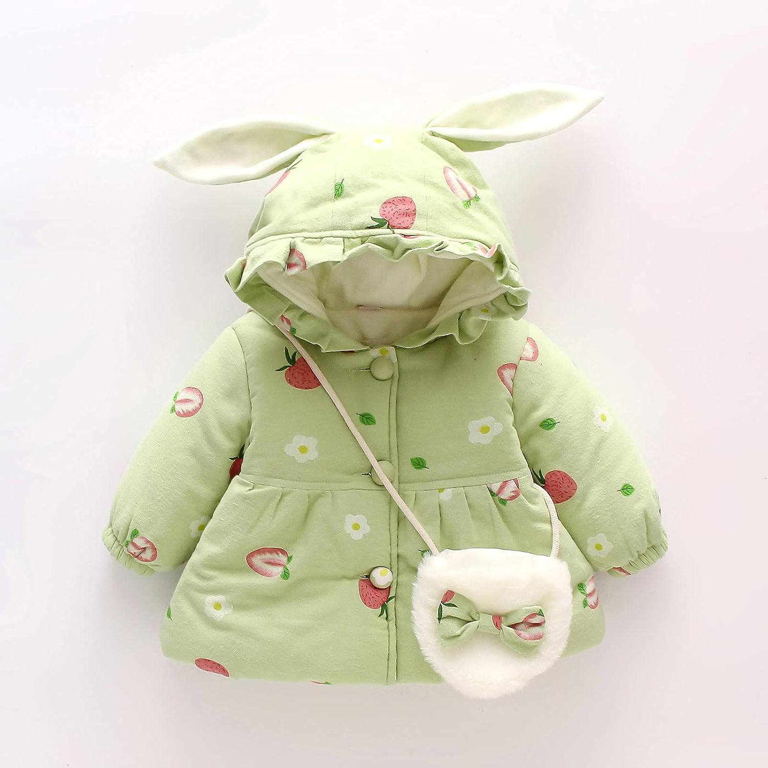 Cette doudoune à capuche pour petite fille combine un design adorable avec une fonctionnalité pratique. Dotée d’une capuche avec oreilles de lapin et un imprimé dessin animé, elle est fabriquée en mélange de coton pour une respirabilité et une douceur optimales. L’ensemble comprend un blouson matelassé épais et un sac à bandoulière coordonné, offrant une tenue complète pour les journées froides.