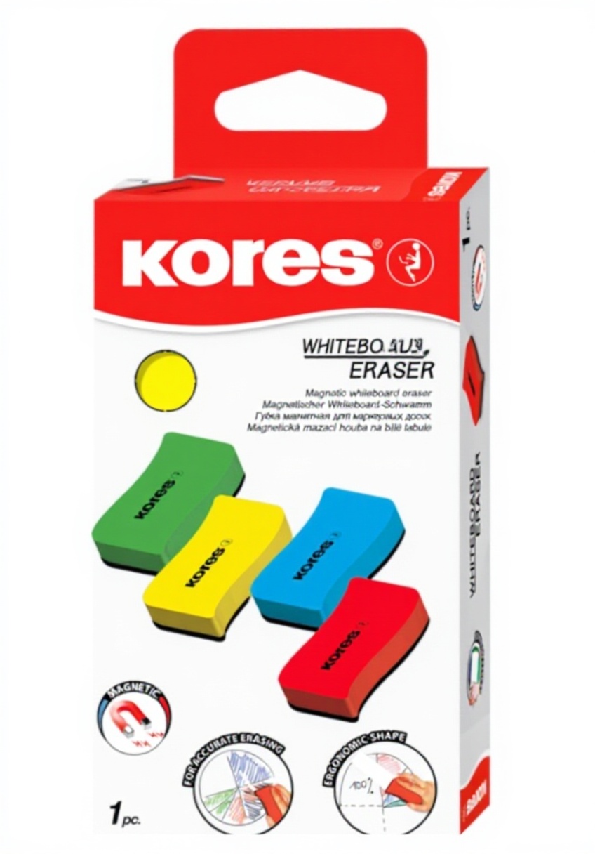 Cet effaceur pour tableau blanc de la marque Kores se distingue par sa conception unique intégrant un noyau magnétique pour une fixation facile sur les surfaces magnétiques. Fabriqué en plastique et métaux ferromagnétiques, il offre une prise en main confortable grâce à sa forme ergonomique et son poids léger de seulement 24 grammes.