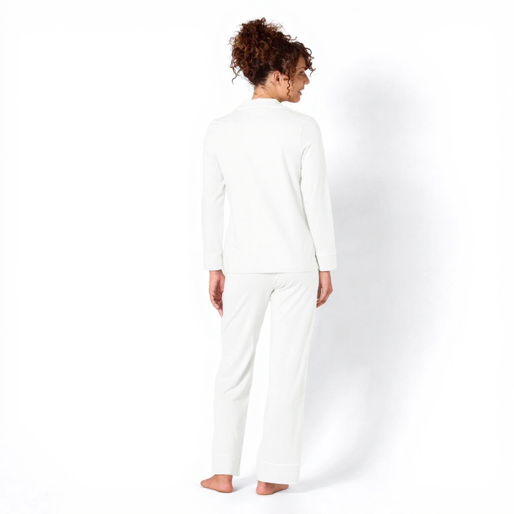 Cet ensemble pyjama se compose d’un haut à manches longues boutonné avec col cranté et poche plaquée, associé à un pantalon à ceinture élastiquée et lien ajustable. Confectionné en jersey de coton modal d’épaisseur moyenne, il offre une sensation de douceur exceptionnelle et une respirabilité optimale pour un sommeil réparateur.