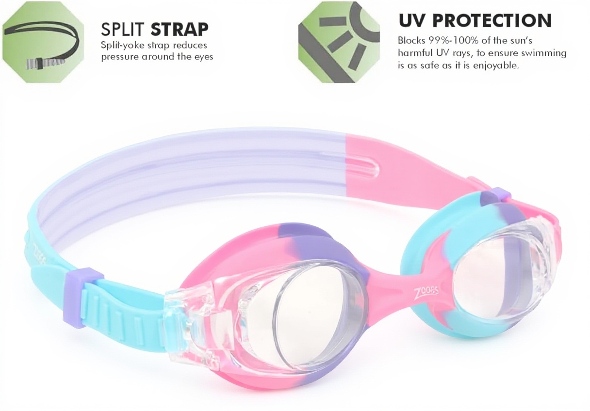 Les lunettes Zoggs Little Bondi sont conçues spécialement pour les enfants avec un cadre en silicone souple et des verres en plexisol offrant une protection UV à 100%. Le système anti-buée intégré et le clip de réglage coulissant garantissent un ajustement personnalisé et une vision claire pendant la baignade.