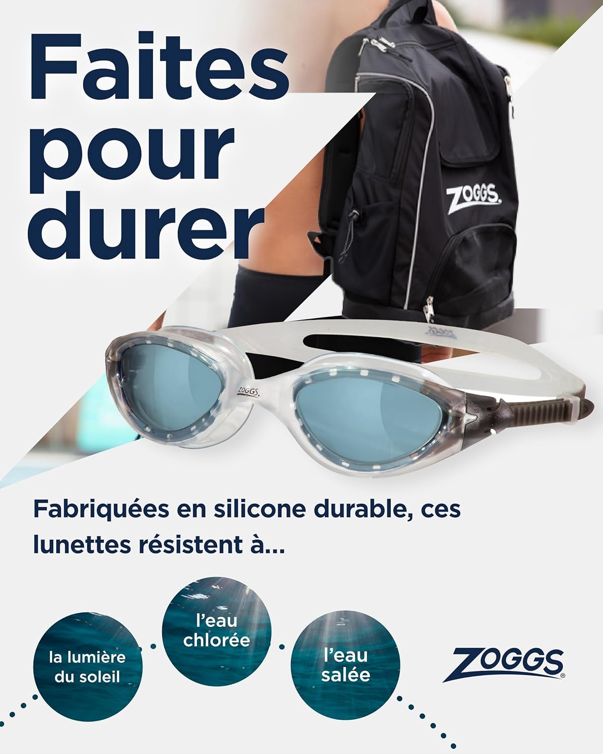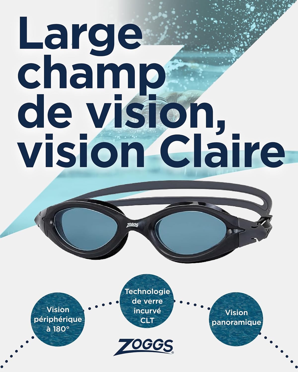 Les lunettes Zoggs Panorama intègrent la technologie de verre incurvé CLT pour un champ de vision périphérique à 180 degrés. Fabriquées en silicone et TPE durables, elles résistent à l’eau chlorée et salée tout en maintenant un ajustement confortable.
