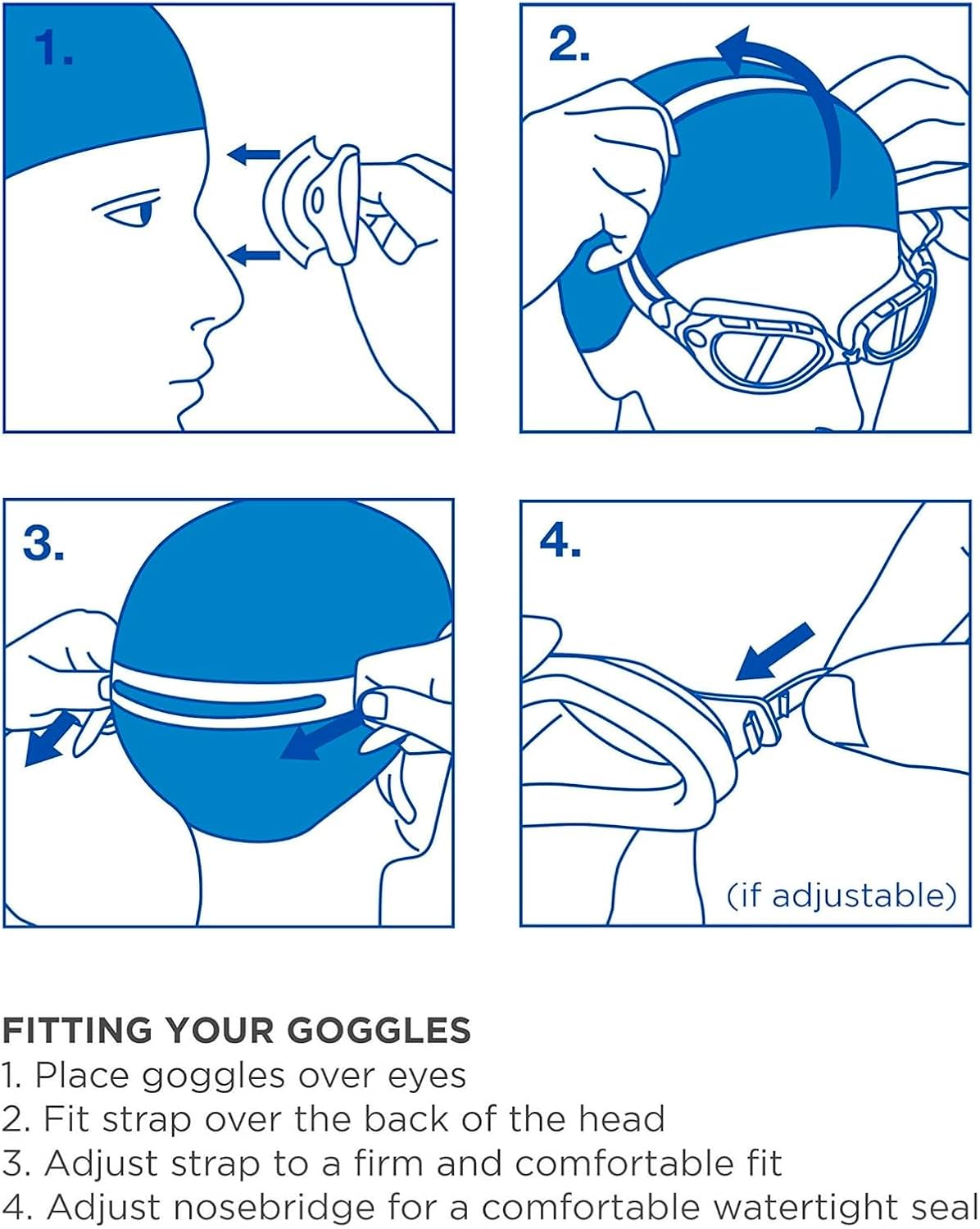 Ajustez la sangle arrière pour un serrage confortable sans pression excessive, en veillant à ce que le joint en silicone épouse bien le contour des yeux.