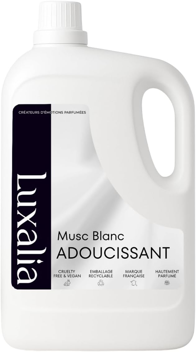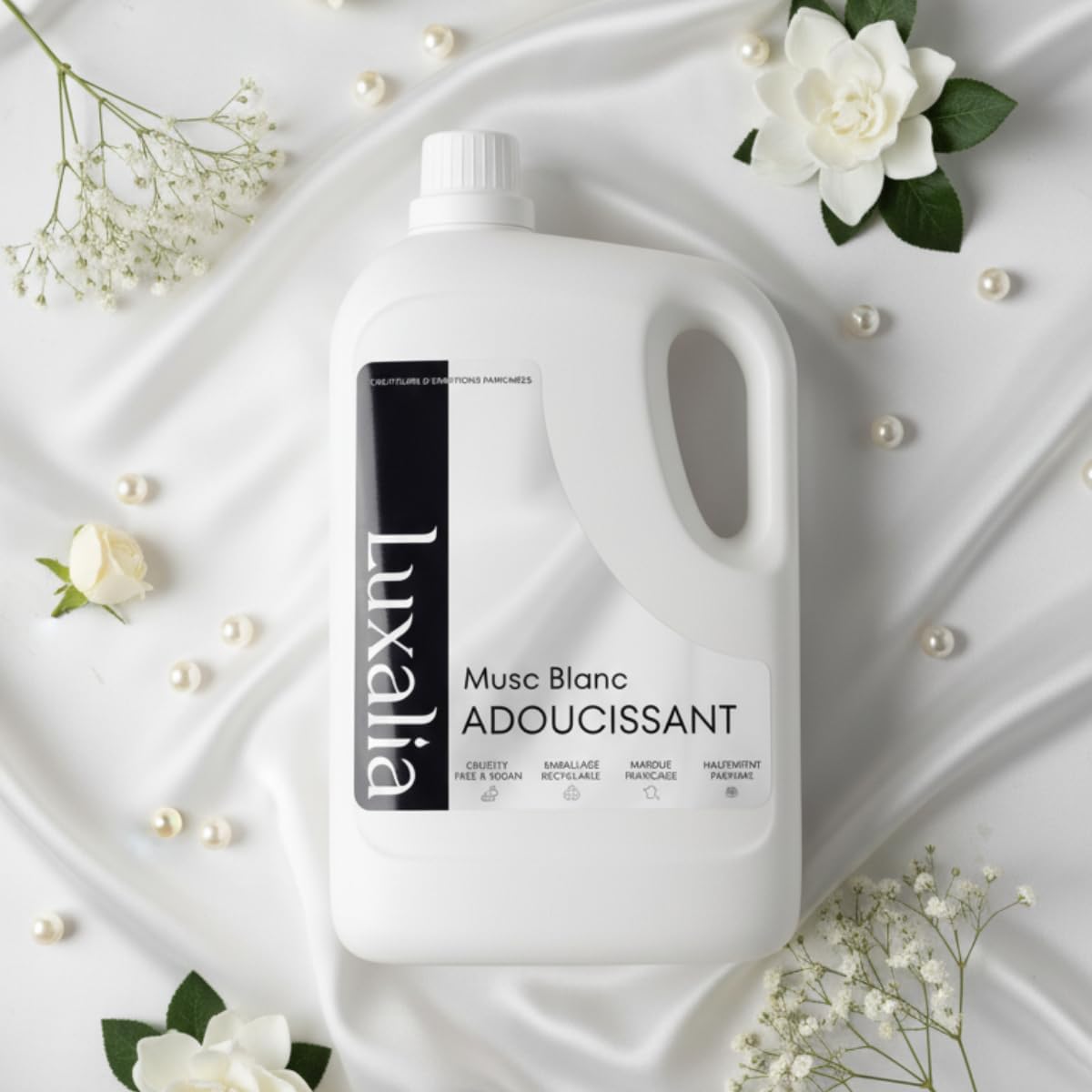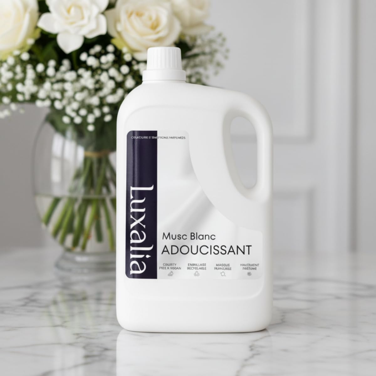 The product measures 20 x 10 x 39 cm and weighs 5 kilograms, making it a large, economical option for frequent use. Manufactured in France by Luxalia, it is identified by reference ADOUCISSANTMUSCBLANC5L and is suitable for standard and high-efficiency washing machines.