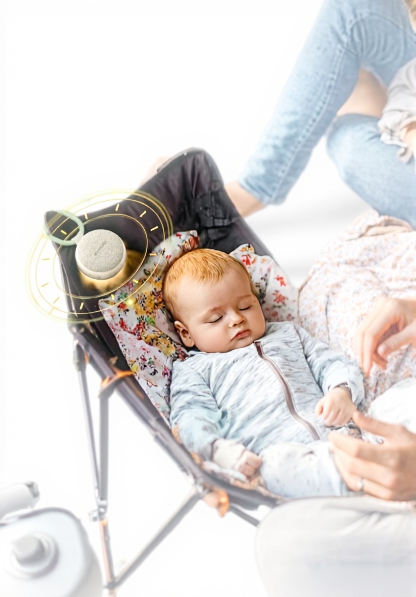 Idéale pour les chambres d’enfant, cette machine s’utilise également en déplacement grâce à sa boucle de suspension qui permet de l’attacher aux poussettes, sièges-auto ou lits de voyage. Elle est parfaite pour les routines du coucher, les siestes diurnes ou lors des voyages en famille.