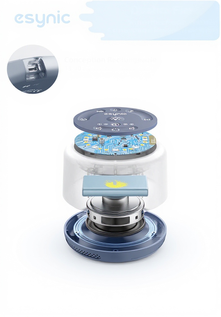 Le produit mesure 10,4 x 10,4 x 6,6 cm pour un poids de 203 grammes, fabriqué par eSynic avec le modèle ESYESY190a. Il nécessite 1 pile et est compatible avec la connexion audio sans fil pour diffuser de la musique ou d’autres sons depuis un appareil mobile.