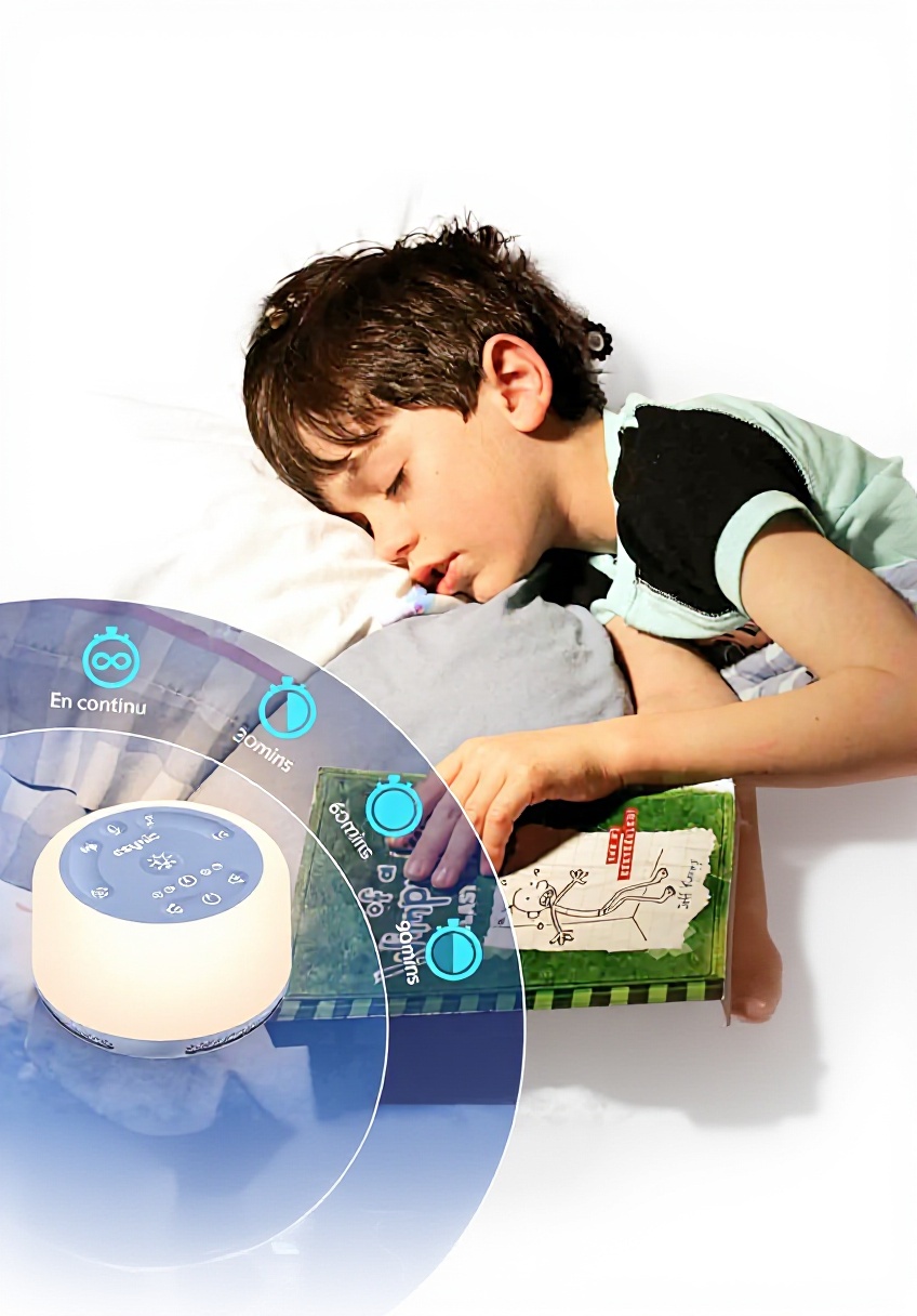 Conçue pour les nourrissons et jeunes enfants, cette machine aide les parents à favoriser l’endormissement et à réduire les réveils nocturnes. Elle s’adresse également aux adultes recherchant une aide au sommeil avec des sons relaxants.