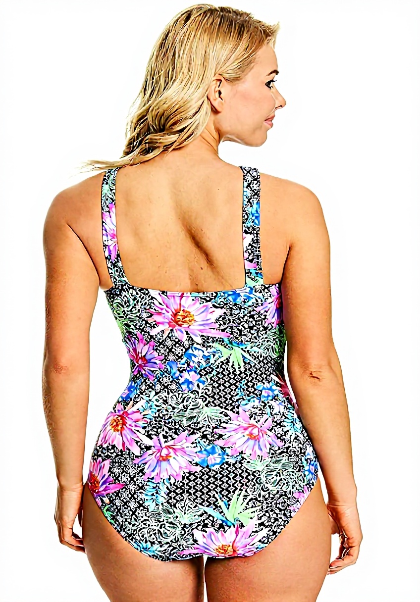 Le maillot de bain est disponible en taille 42 et dans une couleur noir avec des accents multicolores. Conçu pour un ajustement précis, il épouse les formes sans compression excessive. Le tissu Hydrolife, léger et élastique, maintient sa couleur et sa forme même après de nombreux lavages en machine, ce qui en fait un choix pratique et fiable.