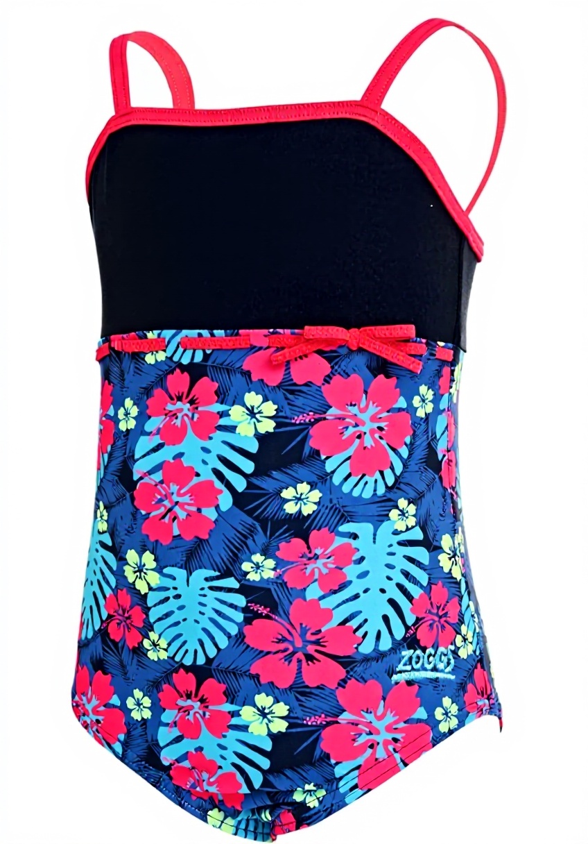 Le maillot mesure environ 39 x 37,5 x 2 cm et pèse 100 grammes. Fabriqué par Zoggs, il est adapté aux filles de 1 à 6 ans, avec un modèle numéro 504619022 et un design bleu marine/multicolore pour un style attrayant.