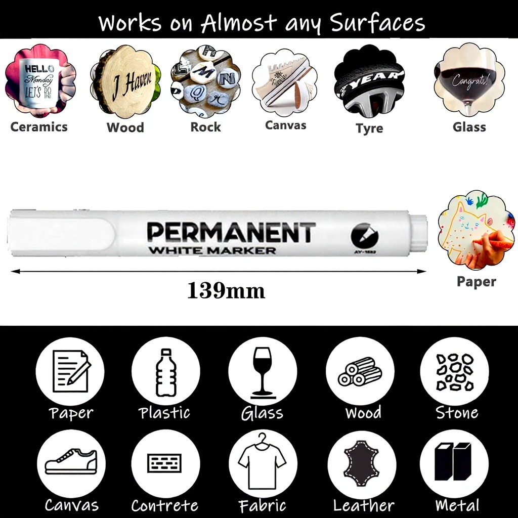 Idéal pour les projets créatifs et professionnels, ce marqueur peut être utilisé sur du bois, de la pierre, du verre, de la céramique, de la toile, des pneus et des textiles. Il est parfait pour la décoration, l’étiquetage ou les travaux manuels nécessitant des marquages permanents et résistants à l’eau.