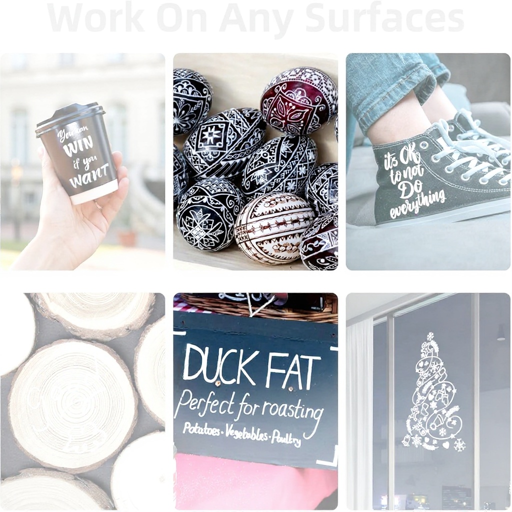 Ces marqueurs sont parfaits pour le marquage sur des surfaces variées en intérieur comme en extérieur. Utilisez-les pour étiqueter des objets en bois, métal, pierre, cuir, céramique ou plastique, que ce soit pour des projets de bricolage, des créations artistiques sur verre ou toile, ou même pour des annotations sur des pneus ou textiles.