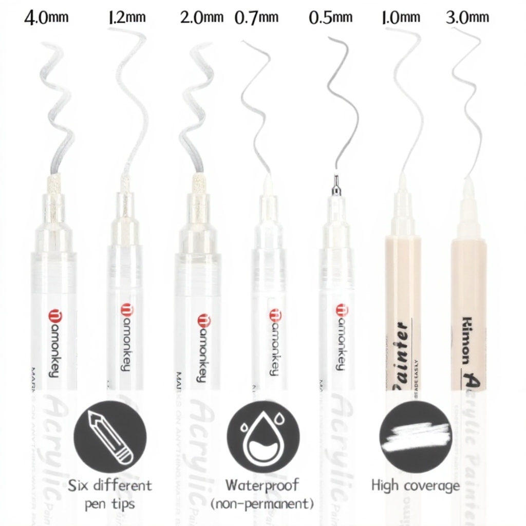 Le lot comprend 6 unités avec des pointes de 0,5 mm, 0,7 mm, 1,2 mm, 2 mm et 4 mm, fabriquées en plastique durable. Chaque marqueur pèse environ 90 g au total, avec des dimensions de colis de 22,2 x 12,1 x 2,1 cm. Le modèle fabricant est makebi025, et l’encre est de couleur blanche pure.