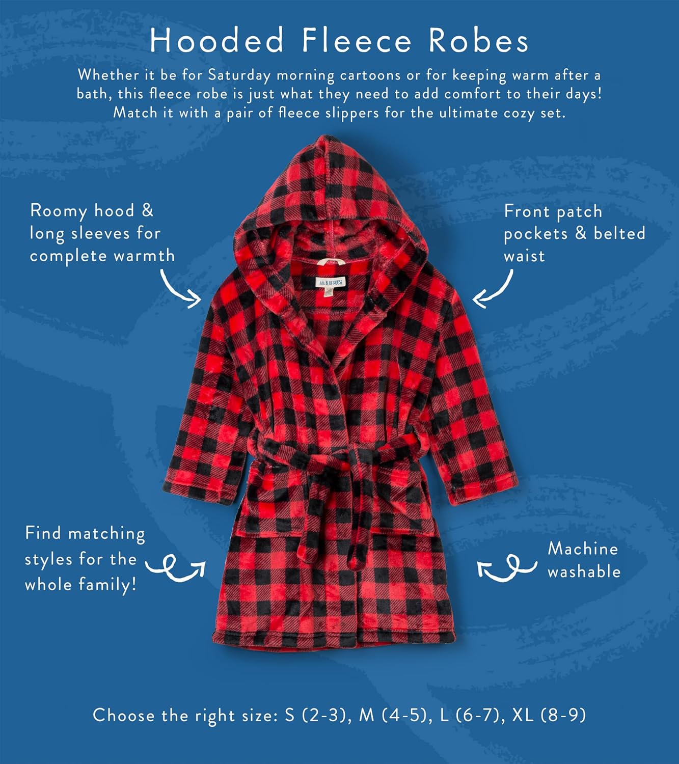 Le peignoir est disponible en tailles XL, L, Petit (2-3 ans) et Moyen (4-5 ans), dans le coloris Plaid Buffalo. Fabriqué par Hatley, il porte le modèle RO2PLAD004 et convient à un usage mixte.