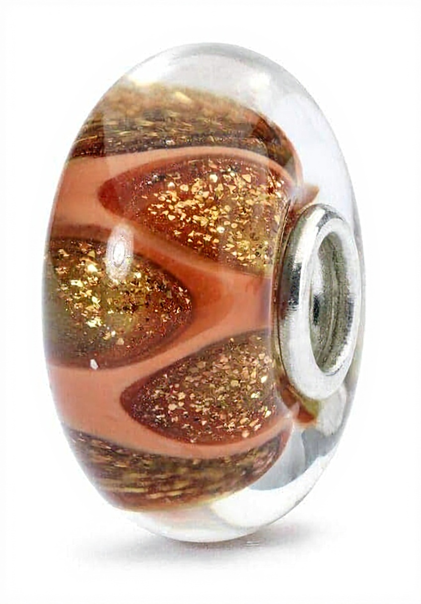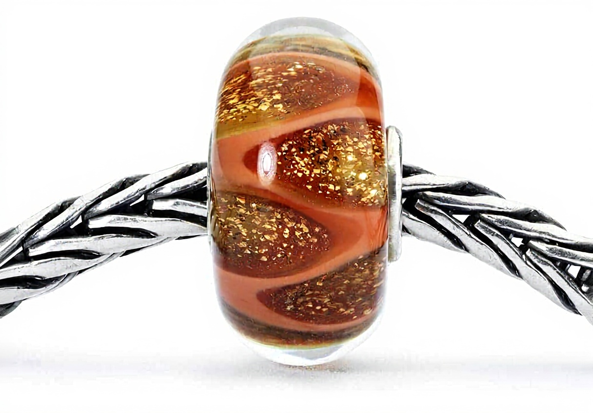 La perle est principalement en argent 925, avec des éléments en verre coloré en brun rouge et des paillettes dorées pour un effet esthétique.