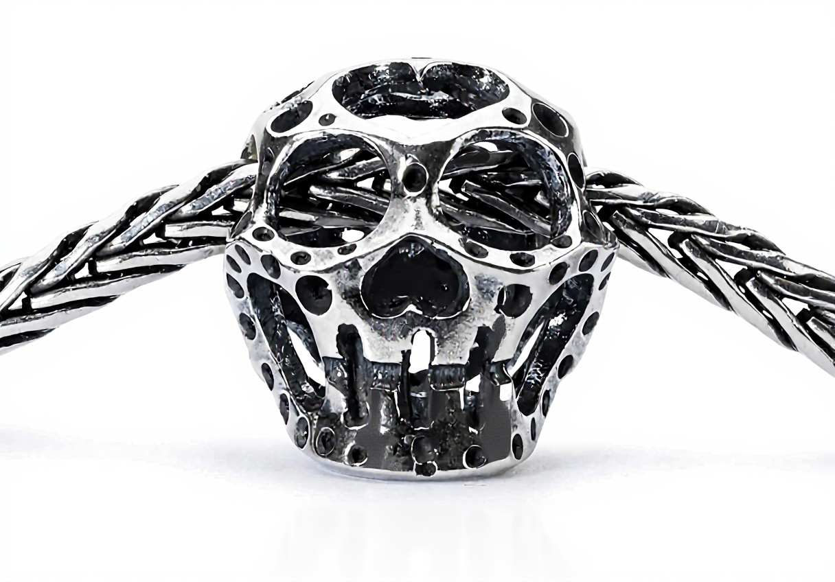 Cette perle Trollbeads est fabriquée en argent 925, garantissant qualité et durabilité. Son design unique avec un motif tête de mort ajoute une touche audacieuse et stylée à vos accessoires, tout en conservant une finition soignée et détaillée.