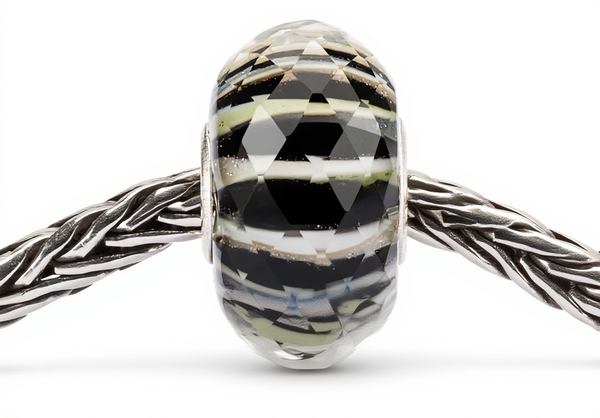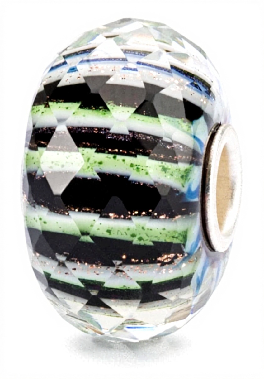 La perle Trollbeads Rationalisation est fabriquée en verre de haute qualité, offrant une finition durable et un éclat captivant. Son design associe des teintes de noir, vert et or pour un look sophistiqué et moderne, parfait pour s’intégrer à diverses créations de bijoux.