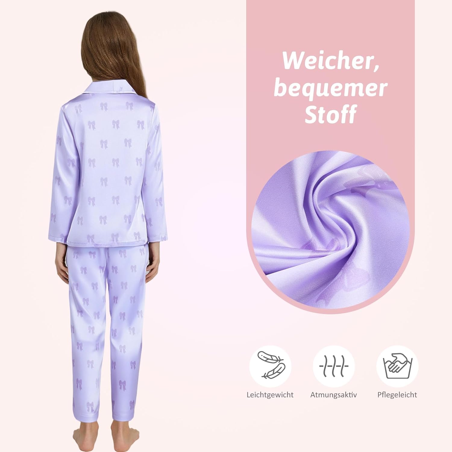 Cet ensemble de pyjama pour filles est confectionné en satin doux composé de 98% polyester et 2% spandex, offrant une sensation agréable sur la peau, une respirabilité optimale et une excellente élasticité. Les motifs mignons comme des arcs, des ours ou des cerises apportent une touche ludique sans se déformer au lavage.