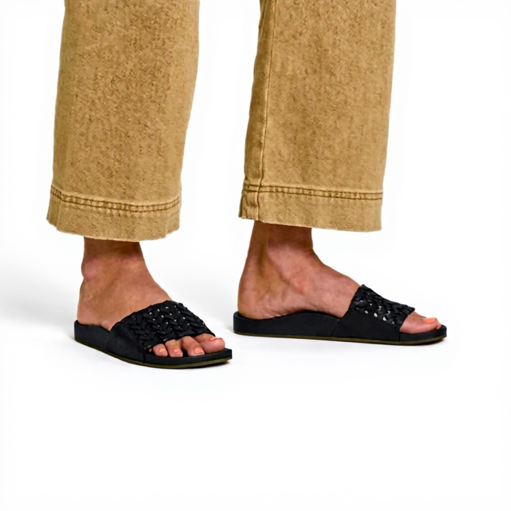 Disponibles en tailles EU 35.5 à 42.5 et en couleurs Noir et Marron Clair, ces sandales sont légères et durables. Leur bande en cuir tissé rembourrée garantit un ajustement confortable, adapté à différentes morphologies.