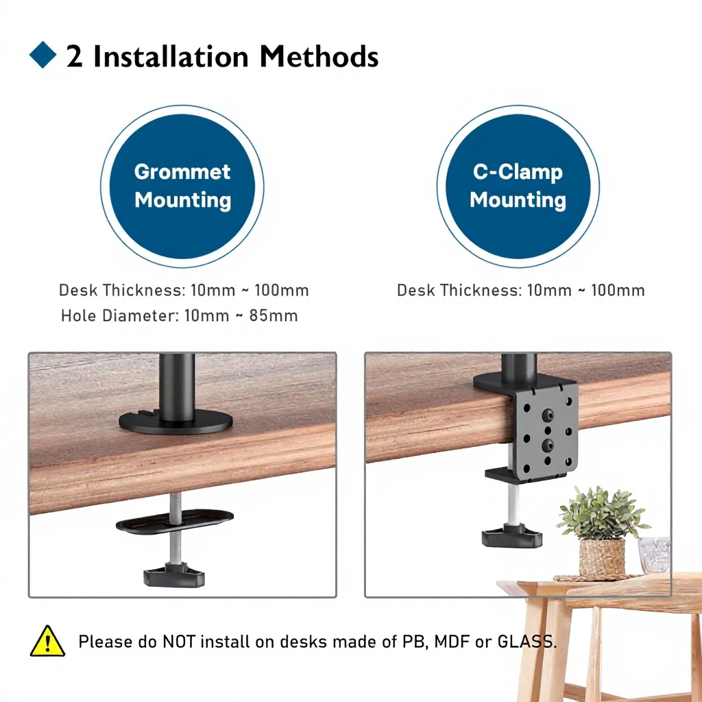 Deux options : pince de table pour bureaux de 10 à 100 mm d’épaisseur, ou montage par percement pour une fixation permanente.