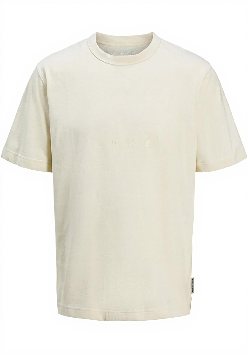 Le t-shirt est disponible en plusieurs tailles (XS à XXL) et couleurs, dont Sweet Corn, Noir et Blanc Éclatant. Il est conçu pour un ajustement standard, idéal pour une silhouette décontractée. Le matériau principal est le coton, garantissant douceur et durabilité.