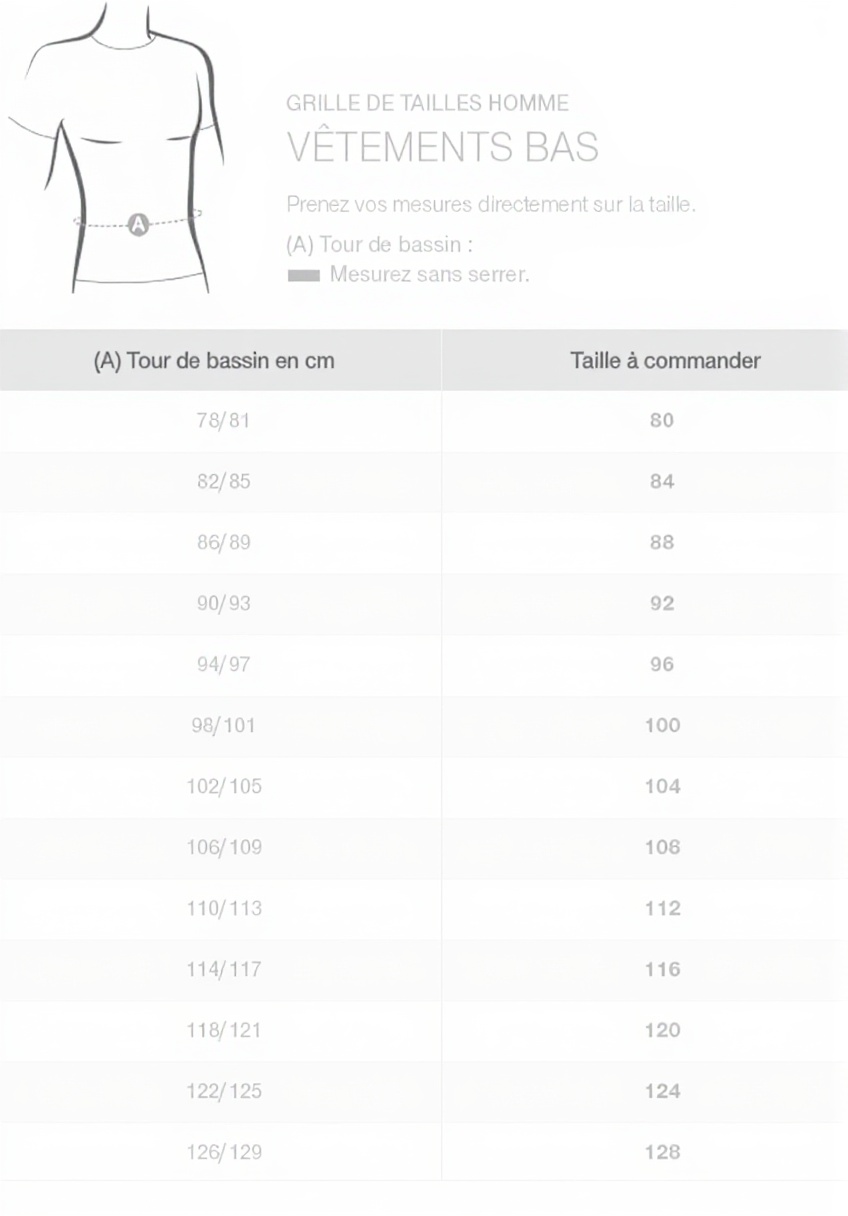 Les tailles suivent les standards français, avec un guide détaillé disponible pour un choix précis.