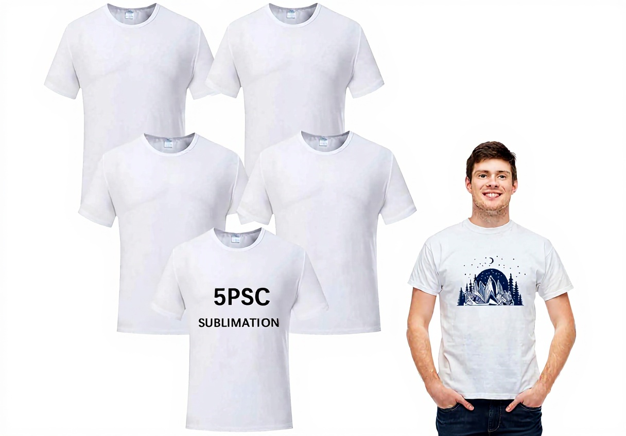Le lot comprend 5 t-shirts de taille unique, disponibles en plusieurs coloris. Le matériau en polyester assure une bonne tenue des couleurs après sublimation. Le poids et la coupe sont conçus pour une utilisation confortable et durable.